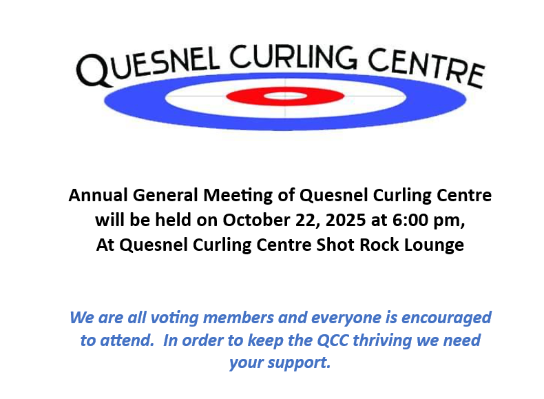 IMPORTANT CHANGE IN MEMBERSHIP AT QCC. Beginning in the 2025-26 season, everyone that joins a league at the Quesnel Curling Center will pay a $5.00 yearly membership fee. This will make you a voting member of the Quesnel Curling Centre. This allows you to vote at the AGM, become a member of the Executive and Committees, and participate in the operations of the centre. We look forward to everyone taking an active role in operation of our non-profit organization.